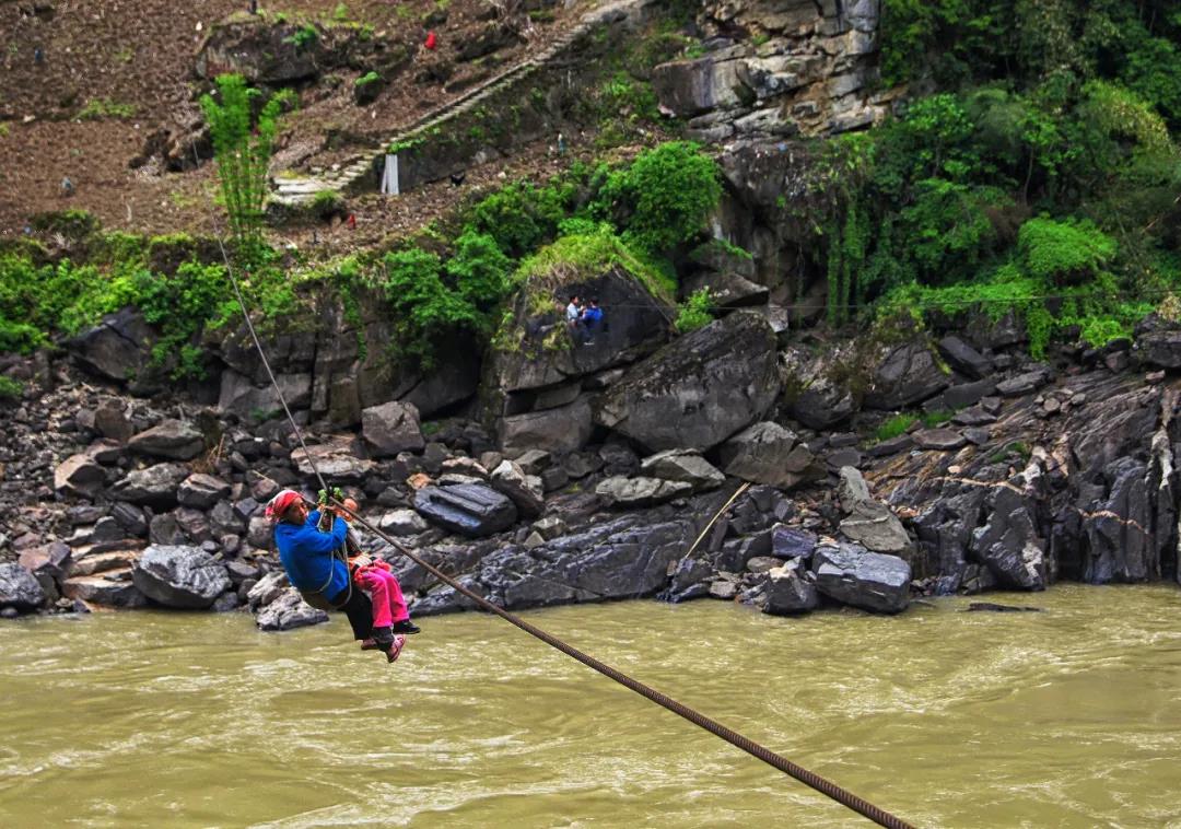 而過河更是兇險,用藤條拴在兩岸的木樁上,要過河的人則把繩子系在腰間,再利用兩岸的落差飛快地劃過去,但落水的風(fēng)險大,甚至常有人被湍急的水流帶走。
