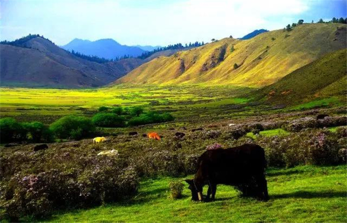 大羊場是一片高原牧場風光,主要由高山草甸組成,在草甸上向東可看見玉龍雪山、哈巴雪山的皚皚白雪;向西可盡覽碧羅雪山那綿延千里的磅礴氣勢;向北可遙望白茫雪山、梅里雪山的英姿;南面穿過原始森林則可到羅古箐情人壩。草甸兼有草原的壯美,又多了一份草原所沒有的靈秀之氣,成片的落葉松是大羊場的一大盛景。每年從5月底開始,一望無際的杜鵑綻放出紫色的花朵,隨著時間的推移,杜鵑由紫變紅,使大羊場變得紅紅火火、無比絢麗。周圍的小山包一座連著一座,構(gòu)成了獨特的高原丘陵景觀。走進大羊場,猶如走進一個夢幻天堂。